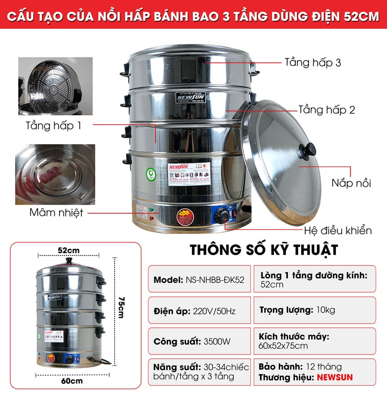 Nồi hấp bánh bao 3 tầng dùng điện 52cm là dòng nồi hấp đa năng NEWSUN vừa hấp chín bánh bao, vừa giữ nóng bánh trong suốt thời gian bán hàng. Thành phẩm bánh thu được căng xốp, không làm bánh bị khô hay nhão do hơi nước quá nhiều nên là thiết bị lý tưởng cho những người kinh doanh bánh hấp.