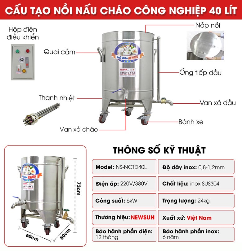 Nồi nấu cháo công nghiệp 40 lít được NEWSUN nghiên cứu thiết kế với nhiều ưu điểm, mang đến những trải nghiệm sử dụng tốt nhất cho khách hàng.