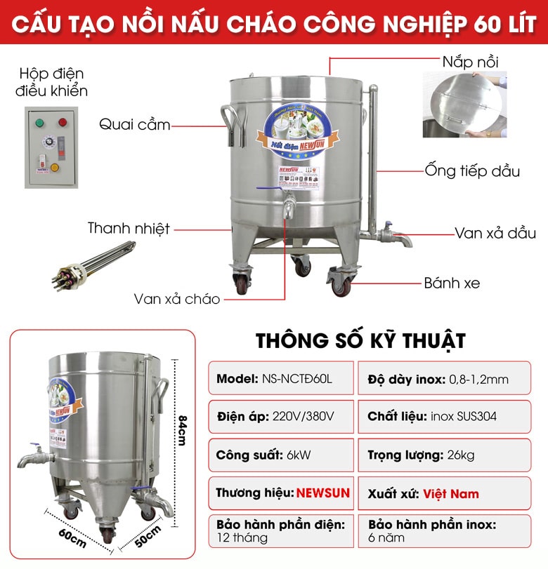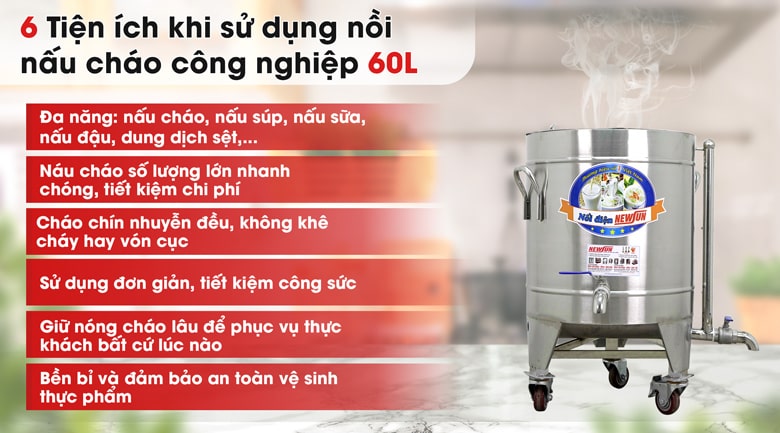 Nồi nấu cháo công nghiệp 60 lít được NEWSUN nghiên cứu sản xuất với nhiều ưu điểm, mang đến những trải nghiệm sử dụng tốt nhất cho khách hàng.