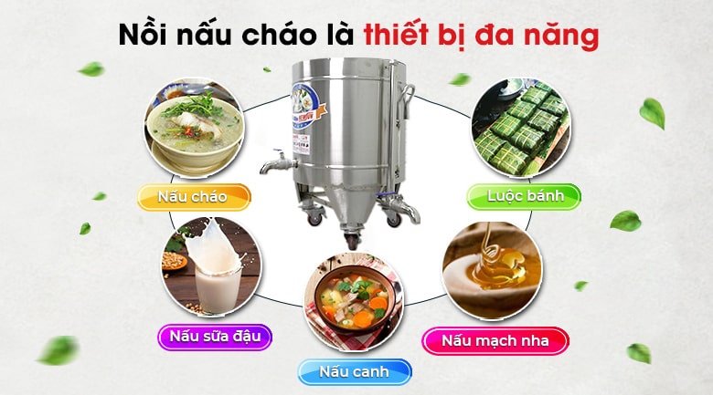 Nồi nấu cháo công nghiệp 60 lít thuộc nồi nấu đa năng, được dùng để nấu đa năng nhiều loại dung dịch dạng sệt và dễ đóng cặn như: nấu cháo, nấu đậu, sữa ngô, sữa bò, nấu đường,…