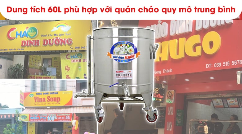 Với dung tích thiết kế 60 lít, nồi nấu cháo dùng điện 60 lít NEWSUN cho sản lượng đáp ứng tốt nhu cầu của các nhà hàng, quán cháo, quán súp, quán cháo dinh dưỡng, bếp ăn mẫu giáo, bếp ăn công nghiệp quy mô vừa.