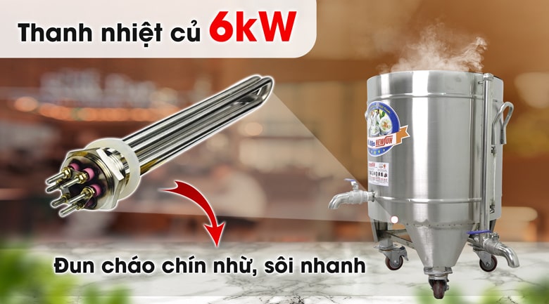 Khác với các loại thanh nhiệt kép, thanh nhiệt chữ U phổ biến trên thị trường, nồi nấu cháo 60 lít NEWSUN sử dụng thanh nhiệt củ công suất 6kW giúp gia nhiệt nhanh hơn gấp nhiều lần.
