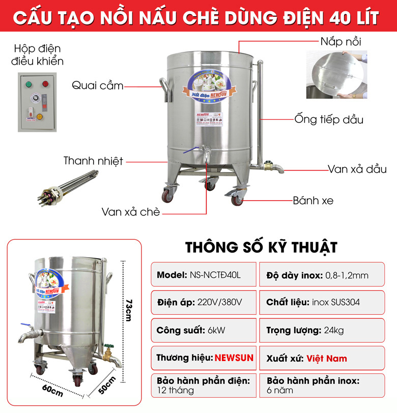 Nồi nấu chè bằng điện 40 lít được NEWSUN nghiên cứu thiết kế với nhiều ưu điểm vượt trội, nhằm mang đến trải nghiệm tốt nhất cho khách hàng.