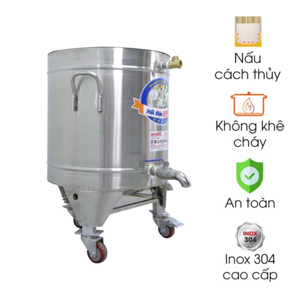 Nồi được thiết kế dạng hình trụ, gọn gàng cùng với bề mặt inox sáng bạc giúp cho cơ sở chế biến thêm phần hiện đại và chuyên nghiệp hơn.