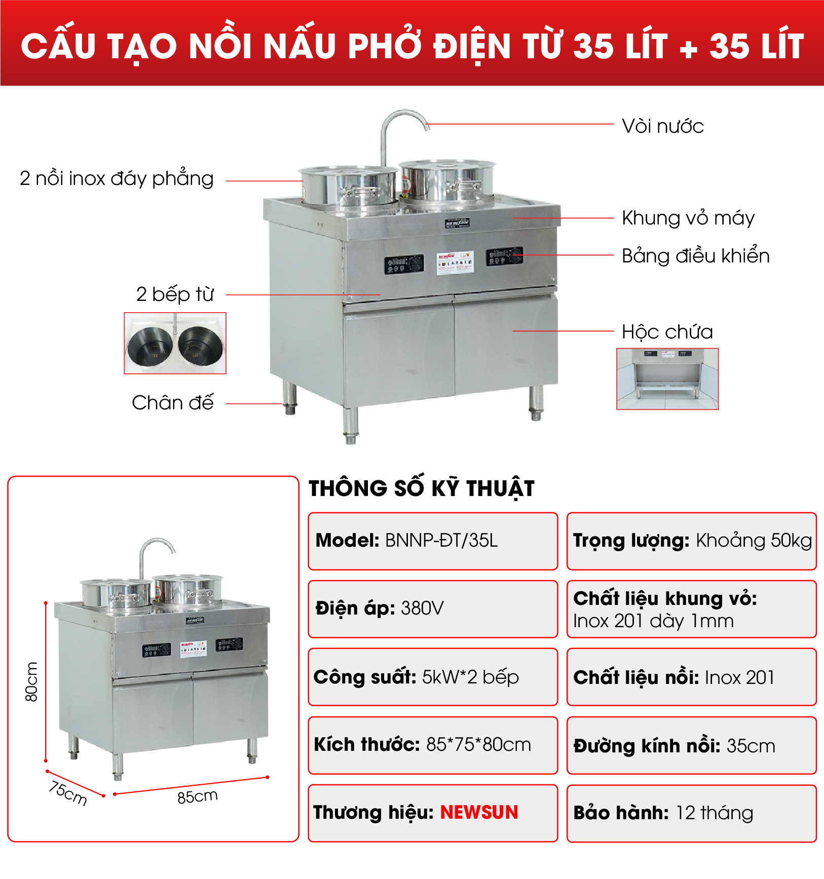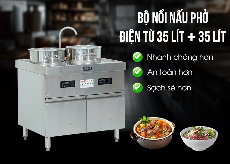 Bộ nồi nấu phở điện từ 35 lít + 35 lít của NEWSUN là sản phẩm thế hệ mới, ứng dụng công nghệ cảm ứng từ hiện đại nhất hiện nay. Với thiết kế thông minh, công suất lớn, khả năng gia nhiệt nhanh chóng và vận hành an toàn, sản phẩm là lựa chọn lý tưởng cho các quán bún phở, bếp ăn công nghiệp, nhà hàng và khách sạn muốn tiết kiệm thời gian, chi phí và nâng cao hiệu suất nấu nướng.