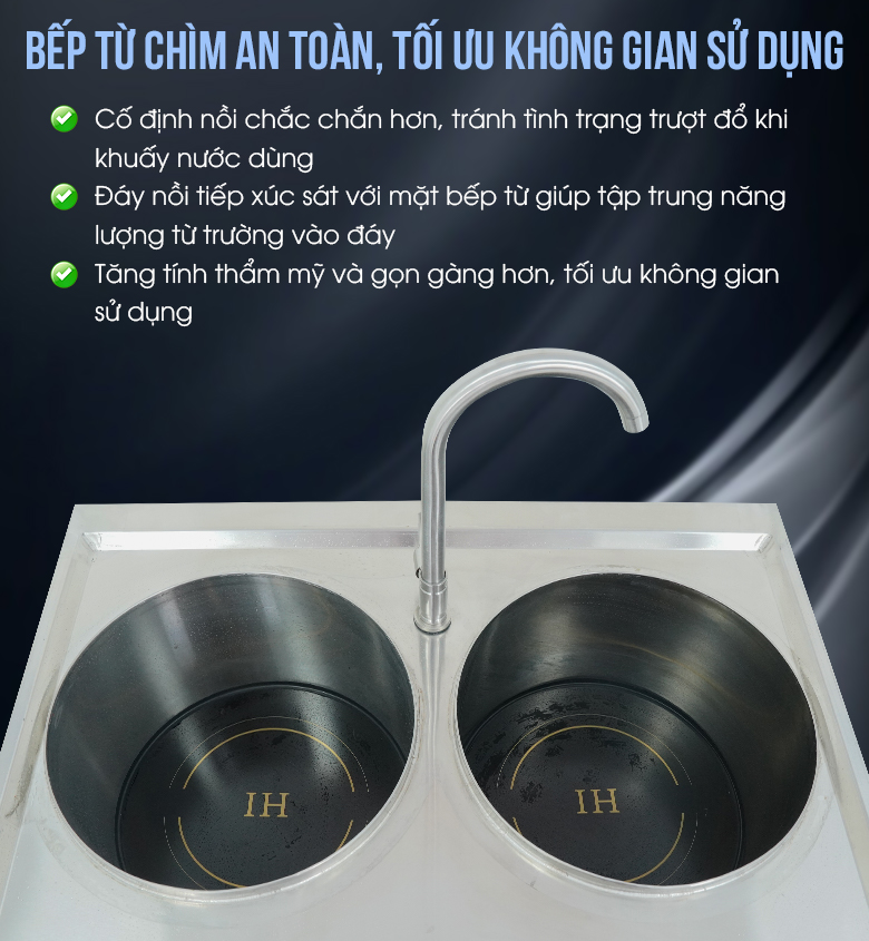 Bếp điện từ gắn liền khung chân bệ: Phần bếp từ được đặt chìm trong khung bệ, giúp cố định nồi chắc chắn, gia tăng hiệu quả gia nhiệt nhờ tiếp xúc sát đáy nồi. Thiết kế này không chỉ giảm thất thoát nhiệt mà còn mang lại vẻ ngoài hiện đại, gọn gàng và tiết kiệm không gian.