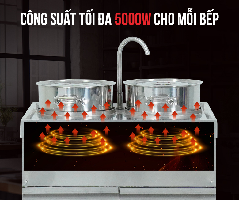 Nồi nấu phở điện từ vận hành với điện áp 380V và công suất tối đa 5000W mỗi bếp, cho khả năng gia nhiệt siêu tốc, nhanh hơn bếp gas 3 lần và bếp điện trở 2 lần. Ứng dụng công nghệ IH (Induction Heating), thiết bị đảm bảo hiệu suất gia nhiệt cao, tiết kiệm năng lượng và an toàn khi sử dụng.