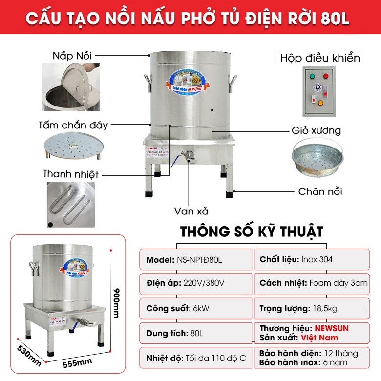 Khi mua nồi nấu phở tủ điện rời 80 lít chính hãng NEWSUN, bạn sẽ được đảm bảo: