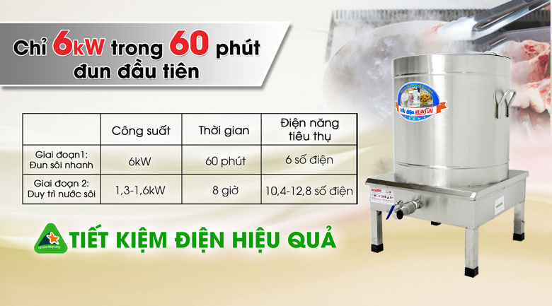 Tuy nhiên, thay vì phải mất vài tiếng đồng hồ để đun sôi lượng nước ban đầu thì nồi tủ điện 80 lít chỉ mất 60 phút để làm điều đó. Thêm nữa, thiết kế thành nồi cách nhiệt giúp nước được giữ nóng lâu hơn mà không cần phải cung cấp nhiều điện năng, chỉ cần để chế độ đun với công suất nhỏ.