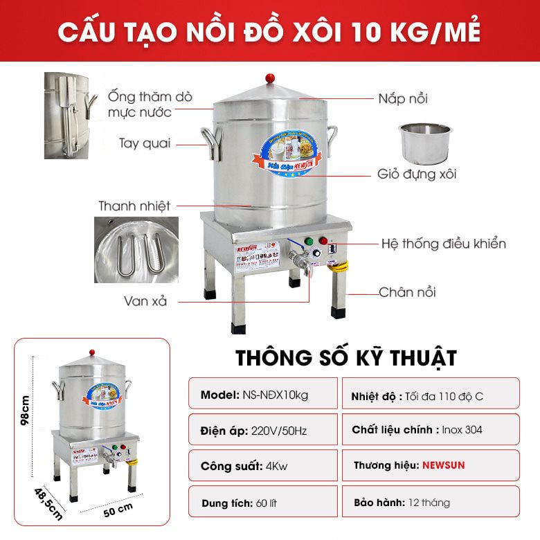 Có thể nói, với rất nhiều ưu điểm nổi bật như: không gỉ, giữ nhiệt tốt, nấu xôi nhanh chóng, thơm ngon, có thể sử dụng đa năng… nồi nấu xôi 10kg/mẻ NEWSUN chính là thiết bị không thể thiếu, là cánh tay đắc lực của bất cứ quán ăn, nhà hàng nào.