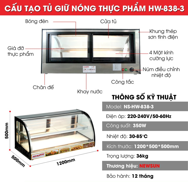 Tủ giữ nóng thực phẩm 838-3 thiết kế dạng khối kín với 2 mặt kính và 2 mặt dùng nhựa mica trong suốt. Song song với đó là khung thân đen bóng không những làm tăng tính thẩm mỹ cho tủ, mà còn giúp không gian cửa hàng thêm phần hiện đại và chuyên nghiệp hơn.