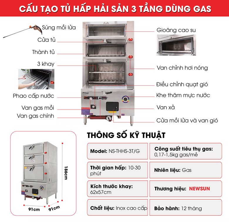 Đơn vị trực tiếp sản xuất và phân phối tủ hấp hải sản 3 tầng dùng gas NEWSUN