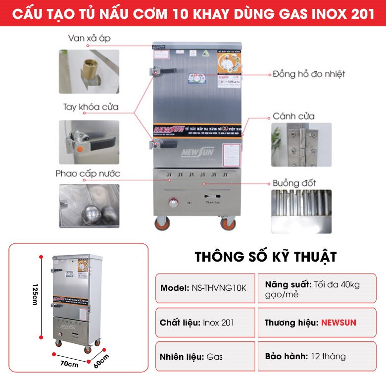 Tủ nấu cơm 10 khay dùng gas inox 201 là sản phẩm thuộc dòng tủ nấu cơm công nghiệp cao cấp do NEWSUN trực tiếp sản xuất và phân phối trên thị trường với chất lượng vượt trội và giá thành tốt nhất.