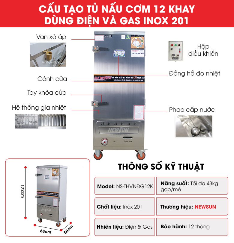 Tủ nấu cơm 12 khay dùng điện & gas inox 201 là sản phẩm được NEWSUN trực tiếp sản xuất và phân phối không qua trung gian nên được đảm bảo cả về chất lượng lẫn giá thành.