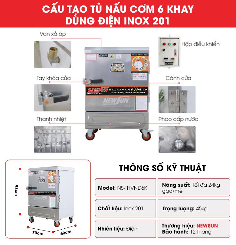 - 4 Đặt hàng tủ nấu cơm 6 khay dùng điện inox 201 chính hãng tại NEWSUN