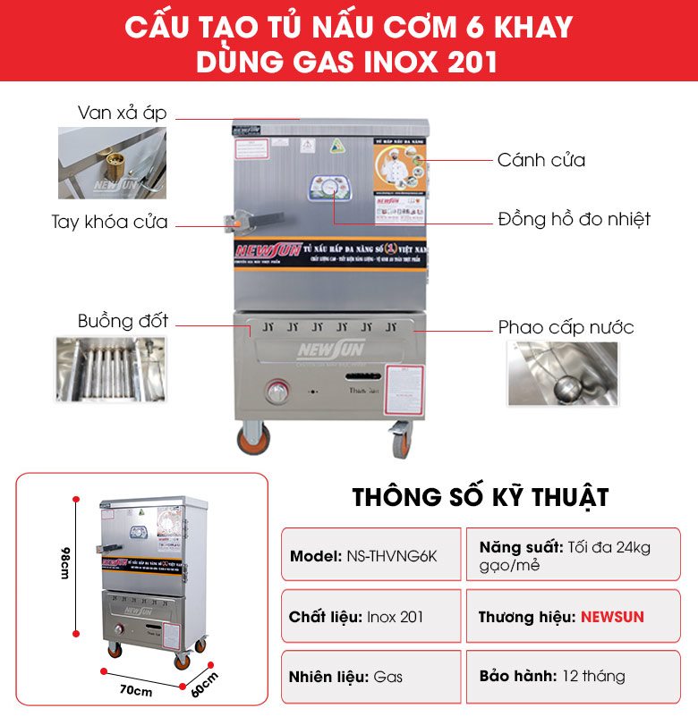 - 4 NEWSUN – Đơn vị cung cấp tủ nấu cơm 6 khay dùng gas inox 201 chính hãng, giá tốt