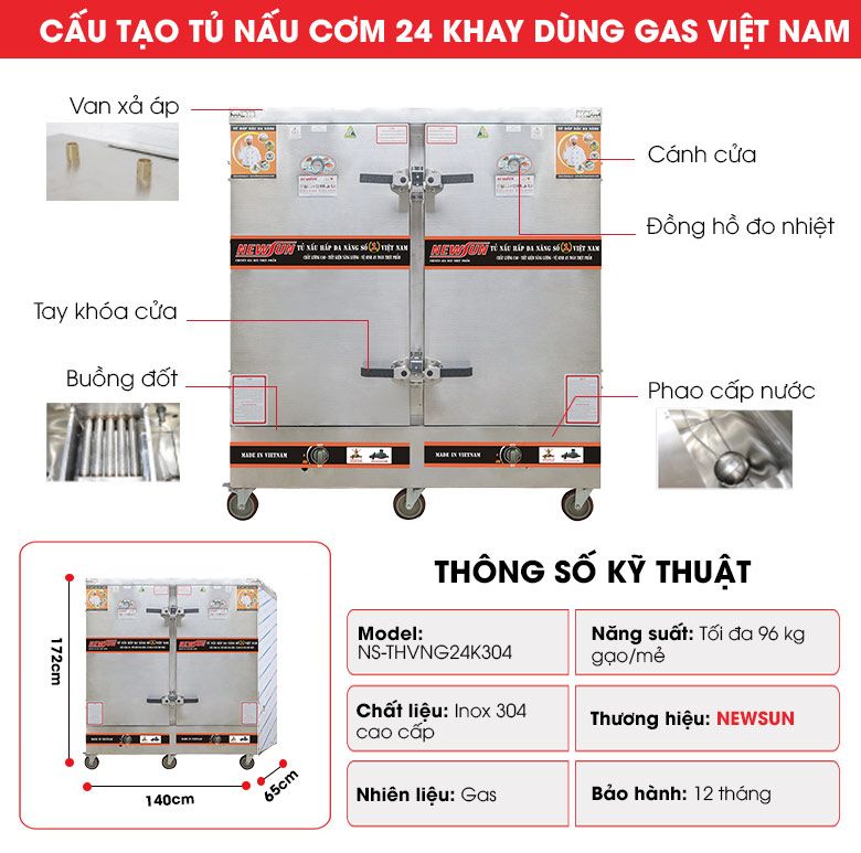 Tủ nấu cơm 24 khay dùng gas Việt Nam là sản phẩm thuộc dòng tủ nấu cơm công nghiệp cao cấp do NEWSUN trực tiếp sản xuất và phân phối trên thị trường với chất lượng vượt trội và giá thành tốt nhất.